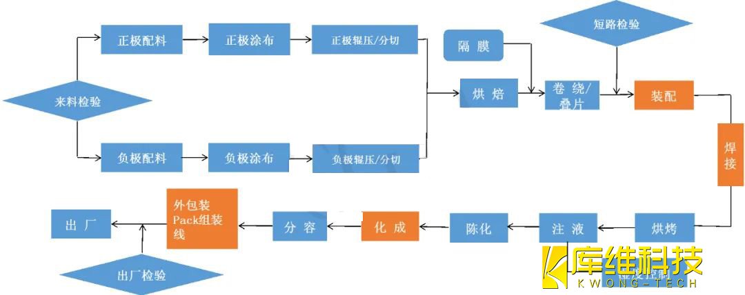 鋰電池制造工藝的基本流程可以分為前中后三段,即前段的配料、涂布、輥壓、分切;中段的卷繞、疊片、裝配、焊接、注液、封口;后段的化成、分容、PACK、倉(cāng)儲(chǔ)物流.