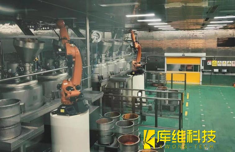 反應釜具有精準控溫功能,并在不同的階段調節(jié)不同的爐溫,炒好之后,再通過管道輸入包裝車間。而包裝環(huán)節(jié)仍然由機器人進行操作,