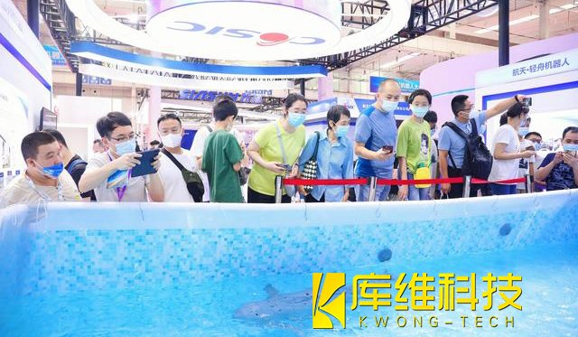 作為為數不多的可以“游泳”的機器人,中國航天科工三院展臺上由沈陽航天新光集團研發(fā)的江豚機器人吸引了很多觀眾的目光。展臺工作人員向記者介紹,該型機器人采用了長江江豚的原始灰色配色,按照長江江豚的運動仿生學,可實現(xiàn)近似長江江豚的游動模式,如上浮、下潛、滾轉、倒退等水中動作,也可預設游動軌跡,實現(xiàn)水中游動表演,具有較高的機動性,“目前此類產品已經接到了不少海洋公園的訂單,而且在探測水質等領域此類機器人也有著很大潛力,因為相比類似潛艇的螺旋槳驅動,仿生運動技術不要求很高的轉速,更加節(jié)約能源。”