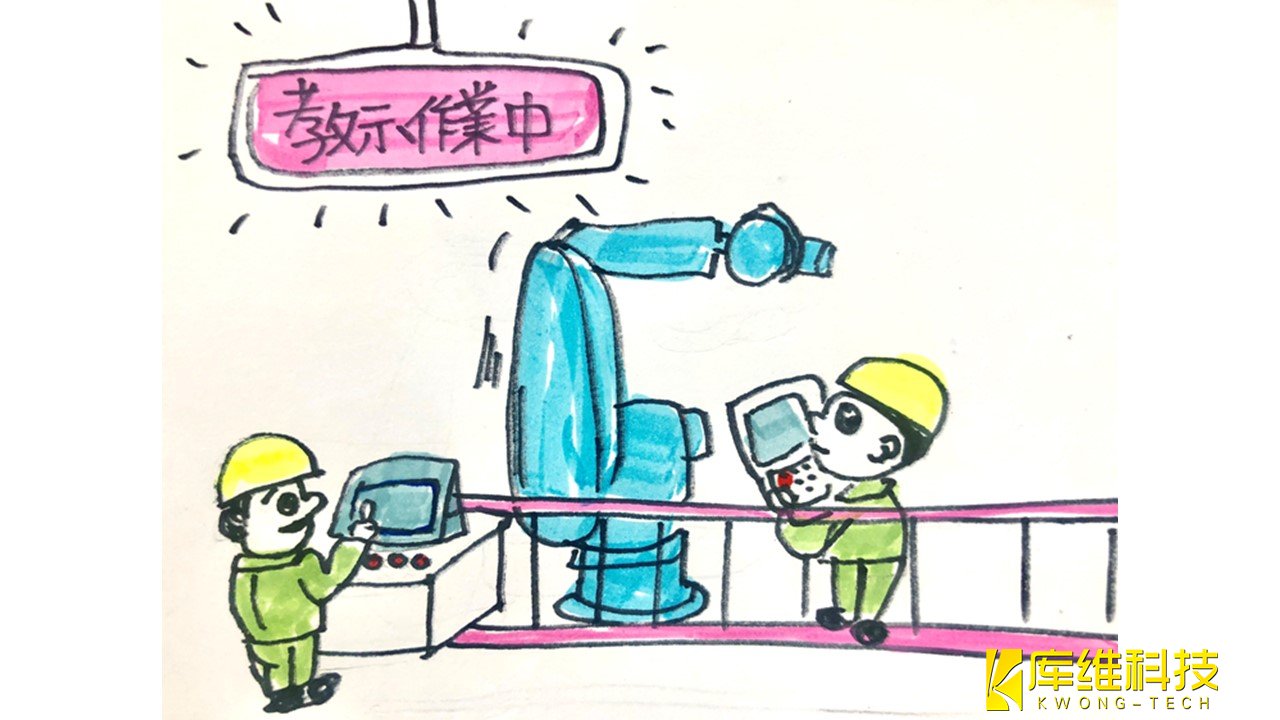 但工業機器人的大部分示教工作都是在驅動源(伺服電源)開啟的情況下完成的,而且工作必須在工業機器人的可移動區域內完 成。這是一項不符合這兩個條件的危險任務。因此,在教學工作中要不斷地有“工業機器人不知道何時動”的危機感,思考“故 障對策”。