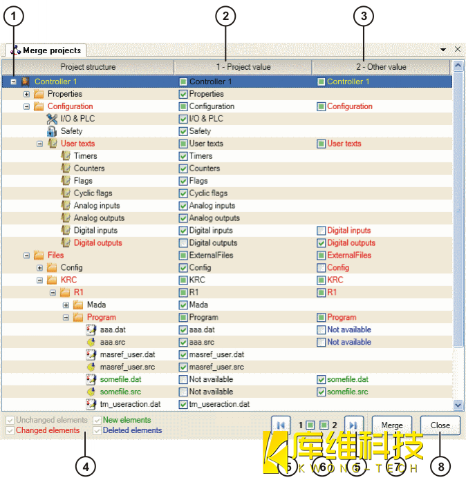 利用 【比較】功能可顯示已存項目與 KR C4 里現(xiàn)有項目之間的差異。 為此,必須將 KR C4 在線項目與已在 WorkVisual 保存的相同項目同時打開。