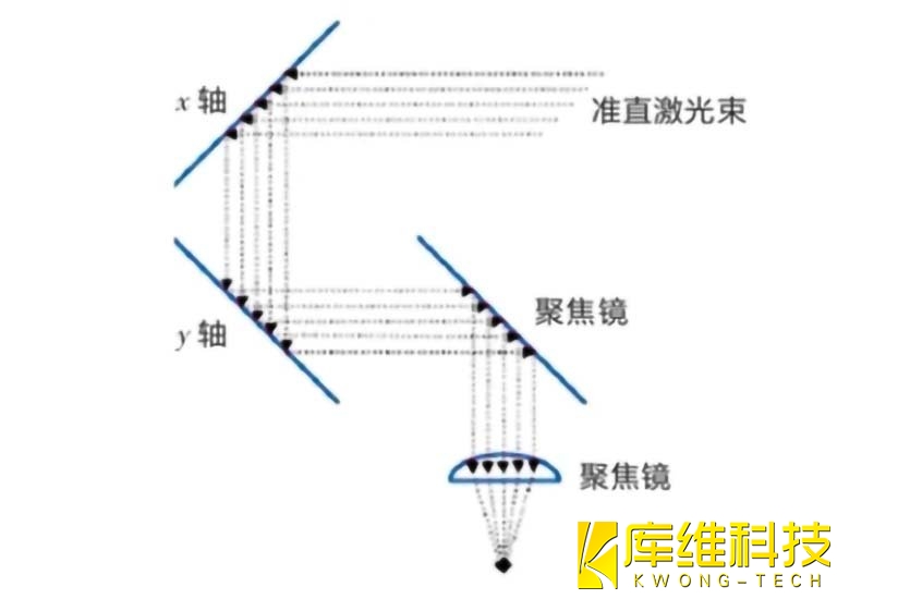 振鏡焊接頭的主要組成部分為擴束準直鏡、聚焦透鏡、XY 兩軸掃描振鏡、控制板卡以及上位機計算機軟件系統。振鏡可以改變激光光束的方向,通過電磁驅動機構帶動擺動或通過步進電機驅動旋轉掃描。通過振鏡的運動,可以實現對光束的快速掃描,控制光斑在焊縫上高速移動,獲得理想的焊縫。光束從QBH進入準直模塊,轉變為平行光束,再經過聚焦模塊進行聚焦,以糾正激光束在聚焦平面上的枕形畸變,保證光束在同一焦平面內的精準移動。目前,實現光束擺動主要通過能夠承受高功率激光的振鏡實現,如圖所示。