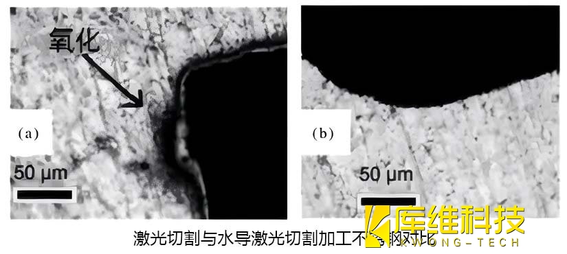 在金屬板材切割方面,用傳統激光與水導激光分別切割不同厚度的AISI1020鋼板,發現水導激光大大降低了材料表面粗糙度,并最大限度減少了與傳統激光切割相關的問題,例如切口和熱損傷。同時,與傳統激光切割相比,水導激光切割產生的白層更小,表面波紋也得到顯著改善。通過對比還發現,在切割速度一致的情況下,水導激光切割在材料表面粗糙程度和內部結構熱影響區方面優勢明顯,這一特性在不銹鋼切割對比中也得到充分驗證。