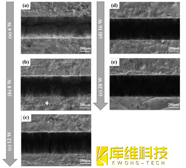 通過圖中不同激光功率下的水導激光對陶瓷材料切槽的 SEM 圖像,我們能夠更加直觀地觀察到加工效果的差異。激光功率的提升,會致使陶瓷材料表面的熔融區寬度以微米級的幅度遞增。而隨著掃描速度的增加,材料的燒蝕深度減小但燒蝕效率提高。水導激光切槽陶瓷材料的表面形貌相對較好。