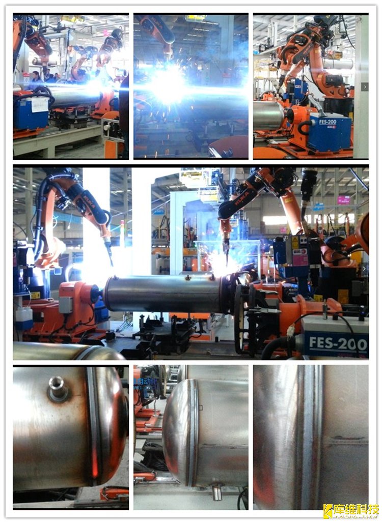 庫維科技于2015年與某企業合作建設智能壓力容器(熱水器內膽)自動化焊接生產線項目,成功實現經濟效益和產能效益雙提升。壓力容器智能機器人柔性自動化生產線是由柔性機器人工作站及輸送線體組成的一站式柔性自動化生產線。生產線通過集成視覺檢測及對位、自動焊接、自動搬運及其它各種輔材等功能來實現壓力容器的自動生產。