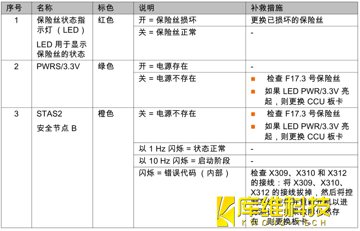 注意:故障的保險裝置以保險裝置旁一個紅色 LED 示出. 故障的保險裝置在排除故障原因后僅允許用操作手冊或設備組件上所印的值來替換.